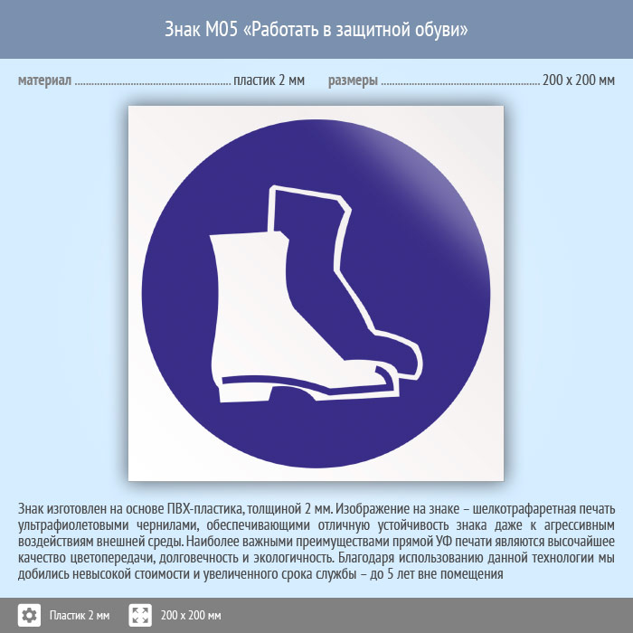 Знак M05 «Работать в защитной обуви» (пластик, 200х200 мм) в Железнодорожном купить