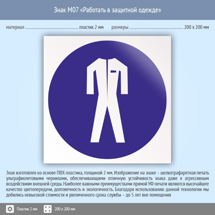 Знак M07 «Работать в защитной одежде» (пластик, 200х200 мм) в Железнодорожном купить