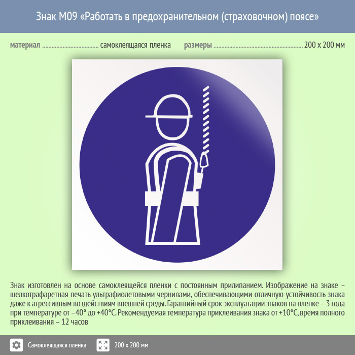 Знак M09 «Работать в предохранительном (страховочном) поясе» (пленка, 200х200 мм) в Железнодорожном купить