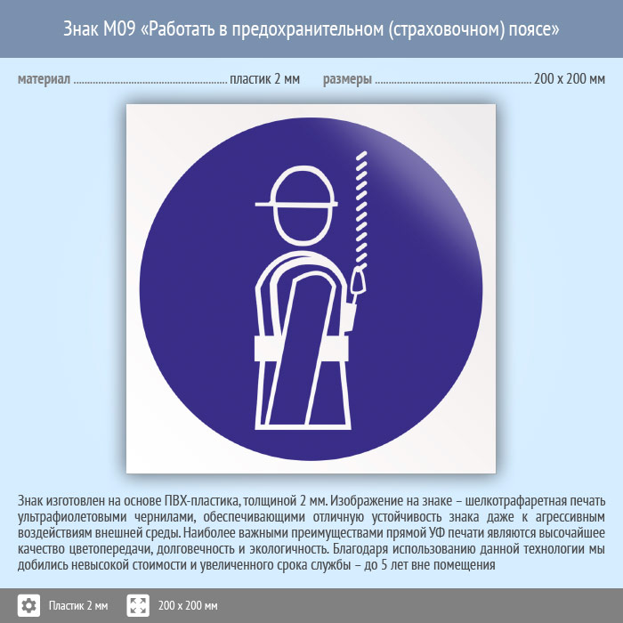 Знак M09 «Работать в предохранительном (страховочном) поясе» (пластик, 200х200 мм) в Железнодорожном купить