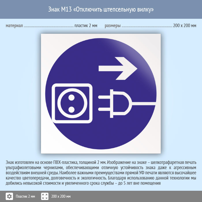 Знак M13 «Отключить штепсельную вилку» (пластик, 200х200 мм) в Железнодорожном купить
