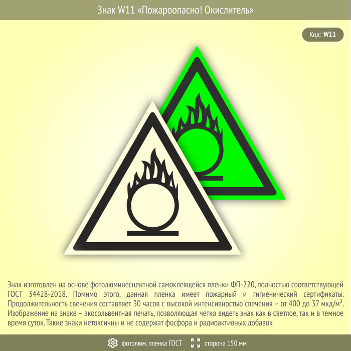 Знак W11 «Пожароопасно! окислитель» (фотолюминесцентная пленка ГОСТ 34428-2018, сторона 150 мм) в Железнодорожном купить