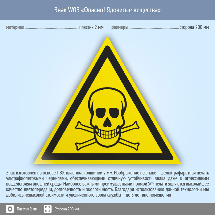 Знак W03 «Опасно! ядовитые вещества» (пластик, сторона 200 мм) в Железнодорожном купить