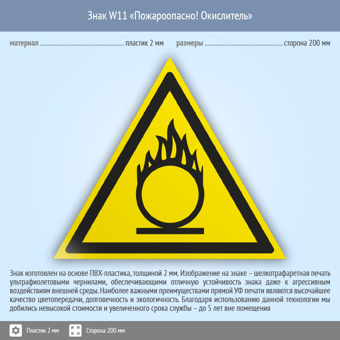 Знак W11 «Пожароопасно! окислитель» (пластик, сторона 200 мм) в Железнодорожном купить