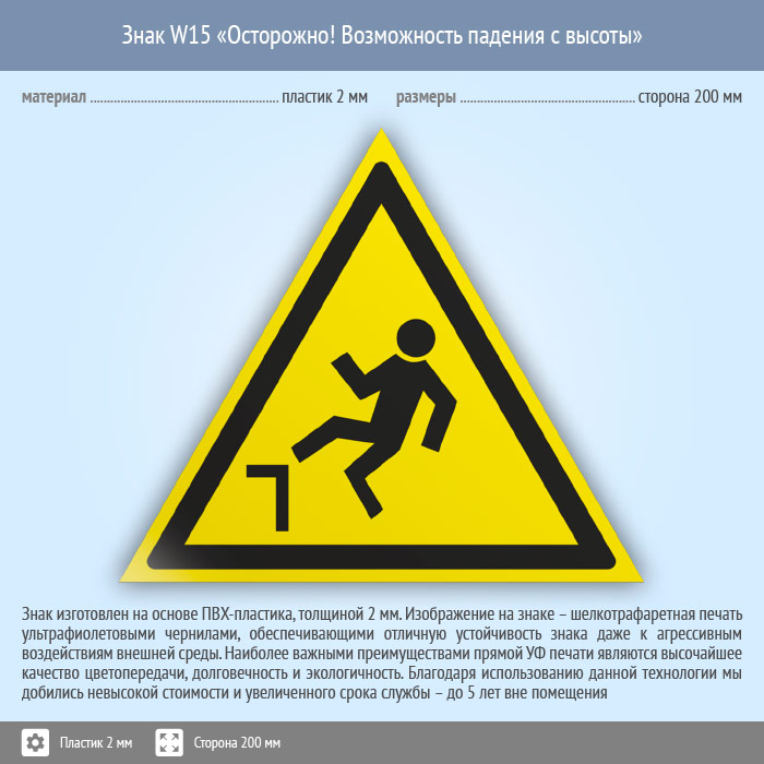 Знак W15 «Осторожно! возможность падения с высоты» (пластик, сторона 200 мм) в Железнодорожном купить