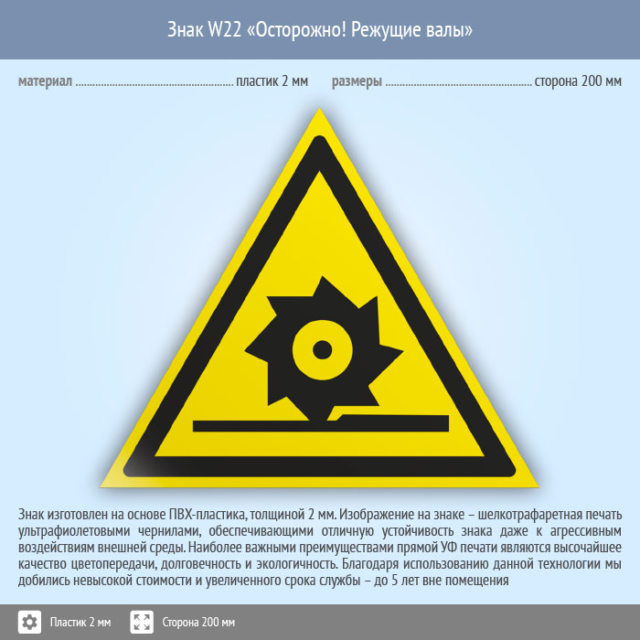 Знак W22 «Осторожно! режущие валы» (пластик, сторона 200 мм) в Железнодорожном купить