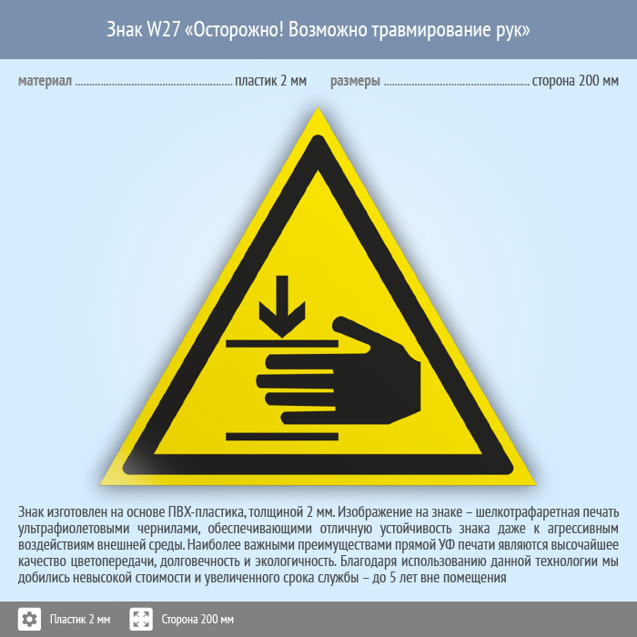 Знак W27 «Осторожно! возможно травмирование рук» (пластик, сторона 200 мм) в Железнодорожном купить