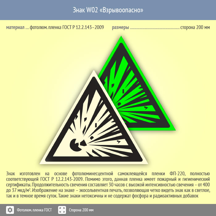 Знак W02 «Взрывоопасно» (фотолюминесцентная пленка ГОСТ 34428-2018, сторона 200 мм) в Железнодорожном купить