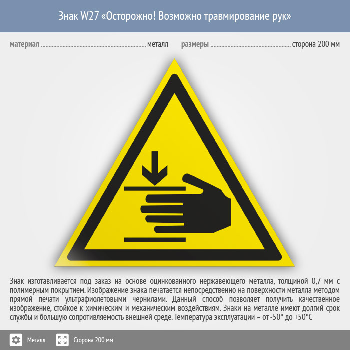 Знак W27 «Осторожно! возможно травмирование рук» (металл, сторона 200 мм) в Железнодорожном купить