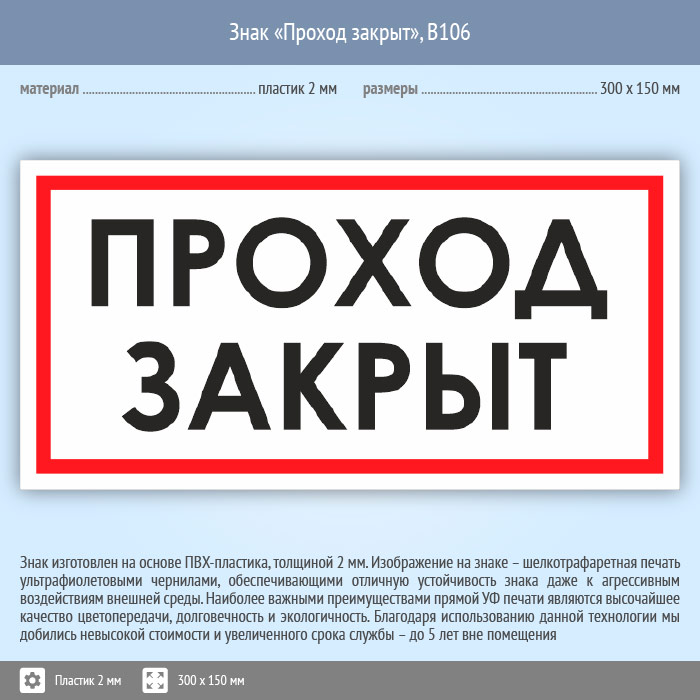 Знак «Проход закрыт», B106 (пластик, 300х150 мм) в Железнодорожном купить