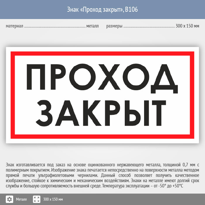 Знак «Проход закрыт», B106 (металл, 300х150 мм) в Железнодорожном купить