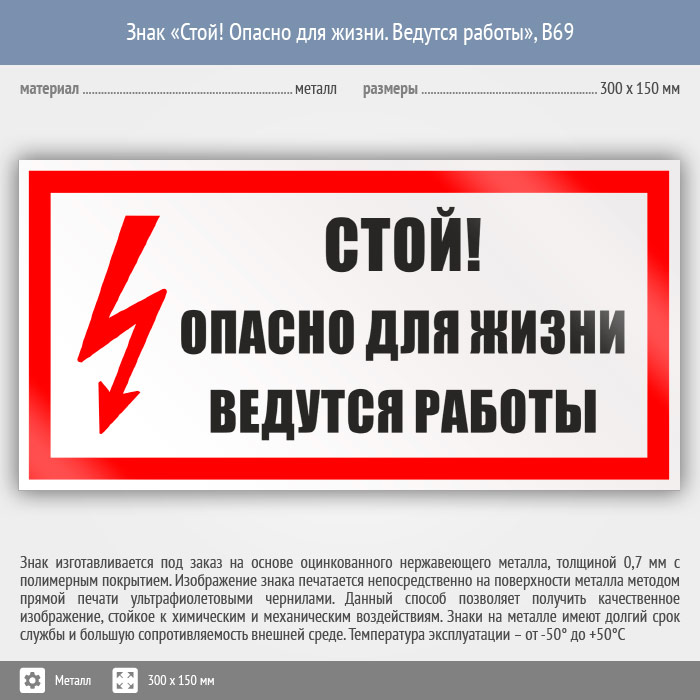 Знак «Стой! Опасно для жизни. Ведутся работы», B69 (металл, 300х150 мм) в Железнодорожном купить