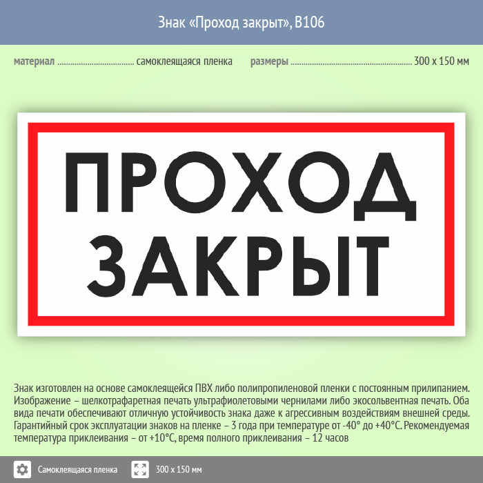 Знак «Проход закрыт» может быть изготовлен любого размера на самоклеящейся пленке, пластике толщиной 0.5, 2 или 4 мм и металле. Также возможно применение фотолюминесцентных и световозвращающих материалов
