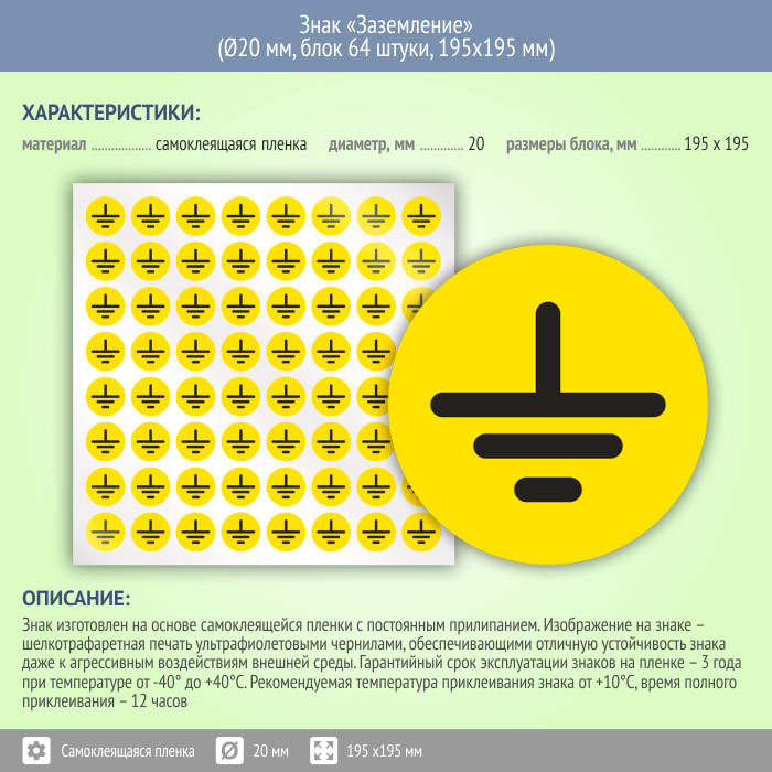 Знак (плакат) «Заземление», S46 (пленка, диаметр 20 мм, блок 64 штуки, 195х195 мм) в Железнодорожном купить