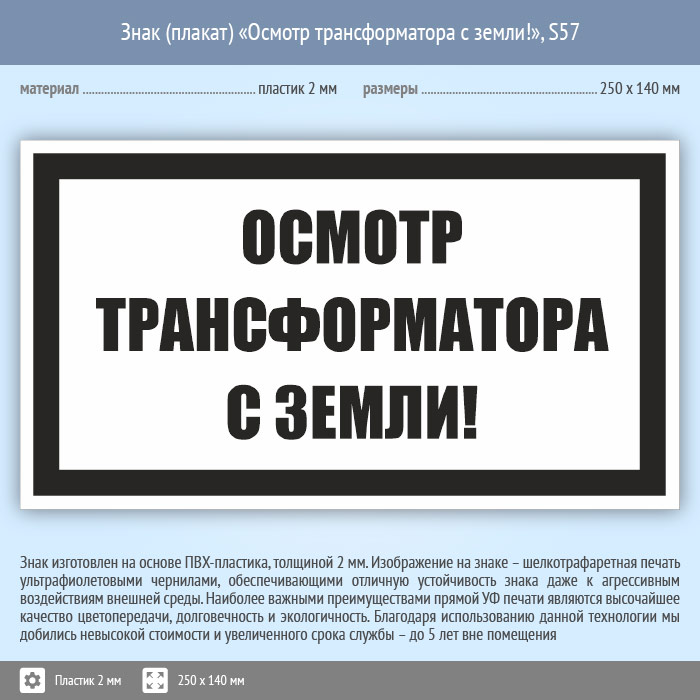 Знак (плакат) «Осмотр трансформатора с земли!», S57 (пластик, 250х140 мм) в Железнодорожном купить