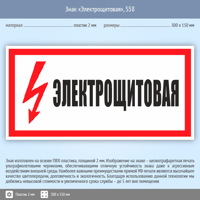 Знак (плакат) «Электрощитовая», S58 (пластик, 300х150 мм) в Железнодорожном купить