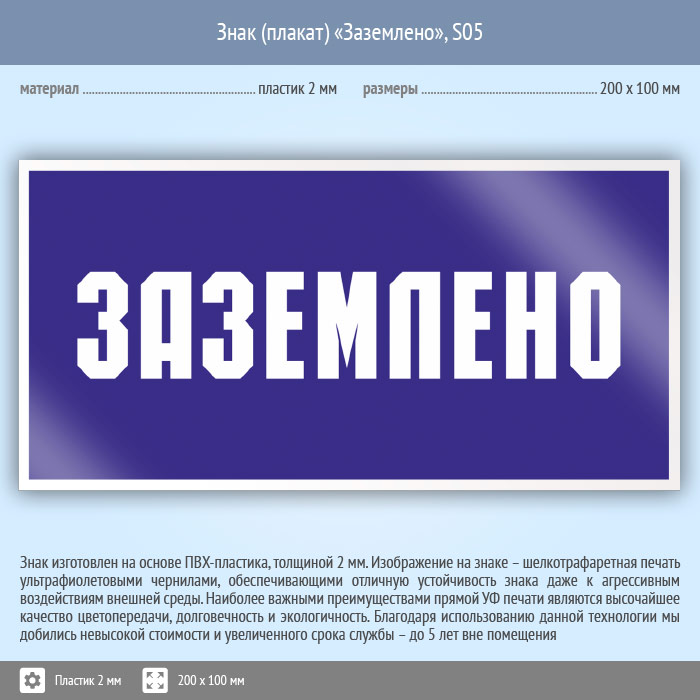 Знак (плакат) «Заземлено», S05 (пластик, 200х100 мм) в Железнодорожном купить