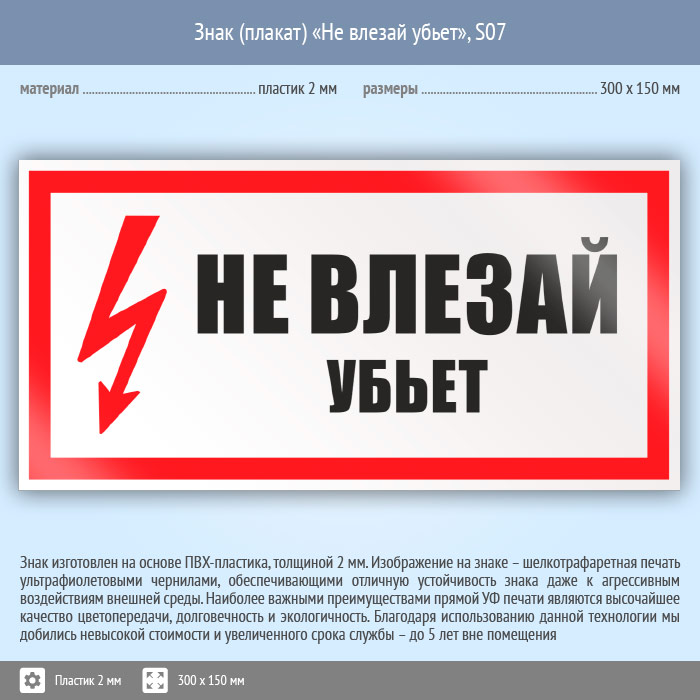 Знак (плакат) «Не влезай убьет», S07 (пластик, 300х150 мм) в Железнодорожном купить