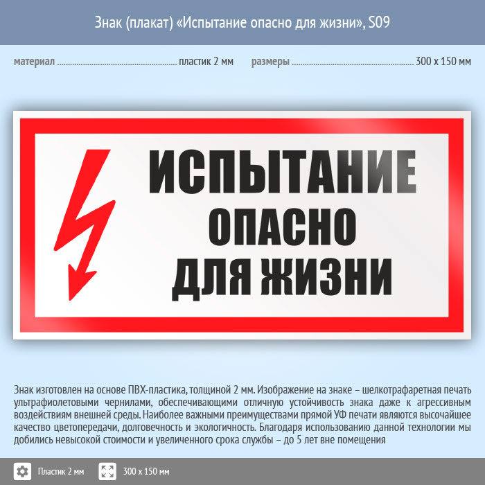 Знак (плакат) «Испытание опасно для жизни», S09 (пластик, 300х150 мм) в Железнодорожном купить