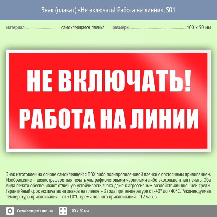 Знак (плакат) «Не включать! Работа на линии», S01 (пленка, 100х50 мм) в Железнодорожном купить