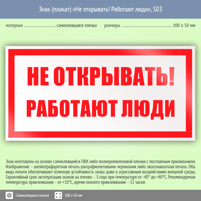 Знак (плакат) «Не открывать! Работают люди», S03 (пленка, 100х50 мм) в Железнодорожном купить