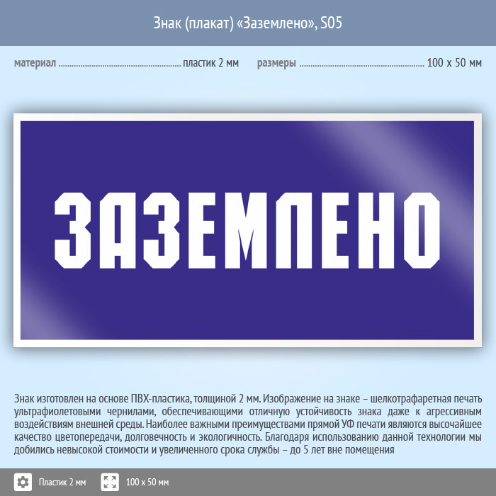 Знак (плакат) «Заземлено», S05 (пластик, 100х50 мм) в Железнодорожном купить