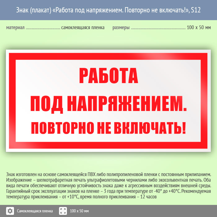 Знак (плакат) «Работа под напряжением. Повторно не включать!», S12 (пленка, 100х50 мм) в Железнодорожном купить