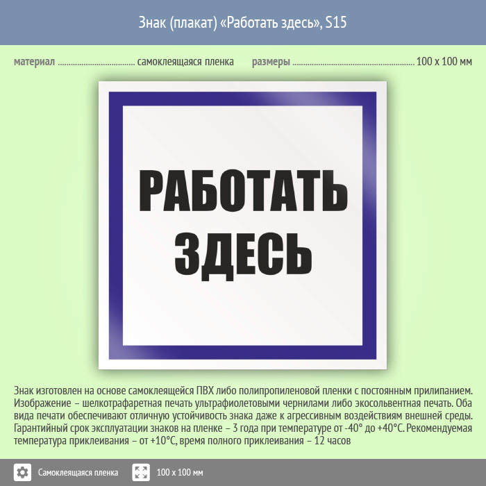 Знак (плакат) «Работать здесь», S15 (пленка, 100х100 мм) в Железнодорожном купить