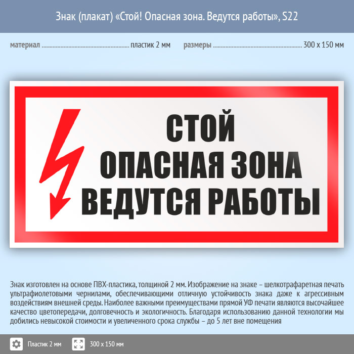 Знак (плакат) «Стой! Опасная зона. Ведутся работы», S22 (пластик, 300х150 мм) в Железнодорожном купить