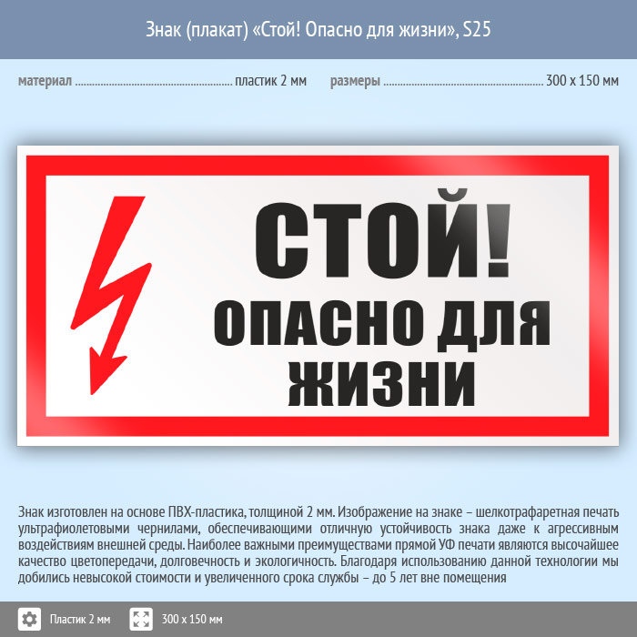 Знак (плакат) «Стой! Опасно для жизни», S25 (пластик, 300х150 мм) в Железнодорожном купить