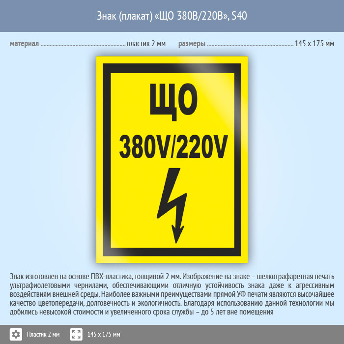 Знак (плакат) «ЩО 380В/220В», S40 (пластик, 145х175 мм) в Железнодорожном купить
