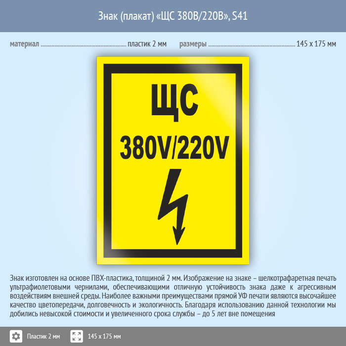 Знак (плакат) «ЩС 380В/220В», S41 (пластик, 145х175 мм) в Железнодорожном купить