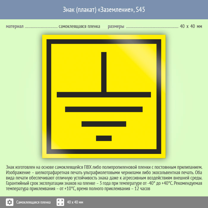 Знак (плакат) «Заземление», S45 (25 штук пленка, 40х40 мм) в Железнодорожном купить