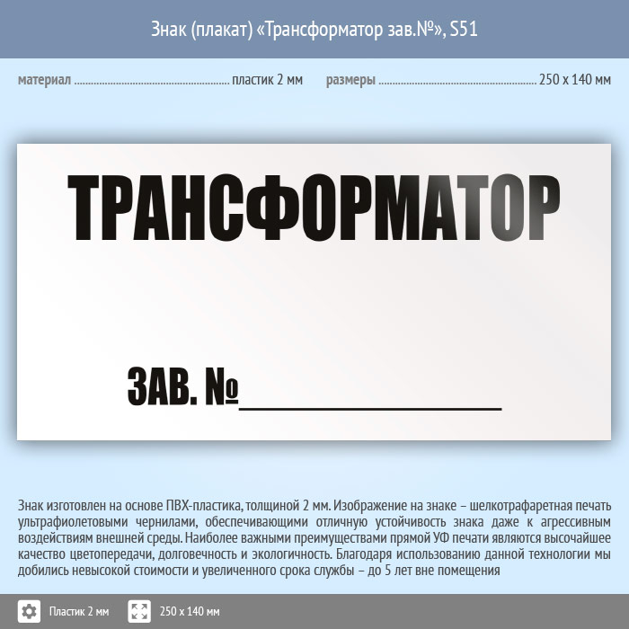 Знак (плакат) «Трансформатор зав.№», S51 (пластик, 250х140 мм) в Железнодорожном купить