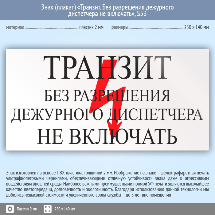 Знак (плакат) «Транзит. Без разрешения дежурного диспетчера Не включать», S53 (пластик, 250х140 мм) в Железнодорожном купить