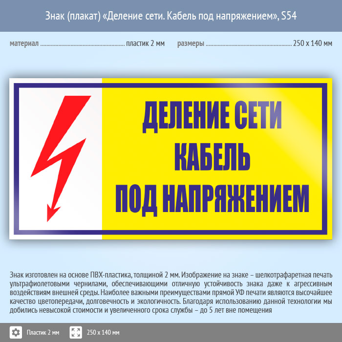 Знак (плакат) «Деление сети. Кабель под напряжением», S54 (пластик, 250х140 мм) в Железнодорожном купить