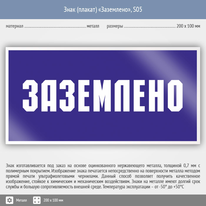 Знак (плакат) «Заземлено», S05 (металл, 200х100 мм) в Железнодорожном купить
