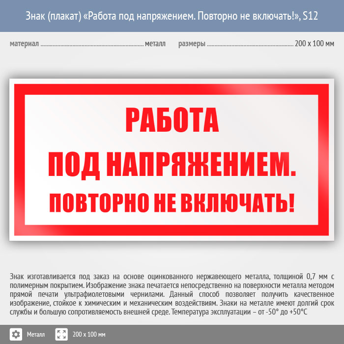Знак (плакат) «Работа под напряжением. Повторно не включать!», S12 (металл, 200х100 мм) в Железнодорожном купить
