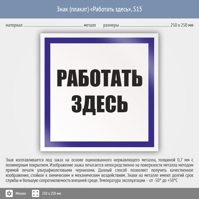 Знак (плакат) «Работать здесь», S15 (металл, 250х250 мм) в Железнодорожном купить