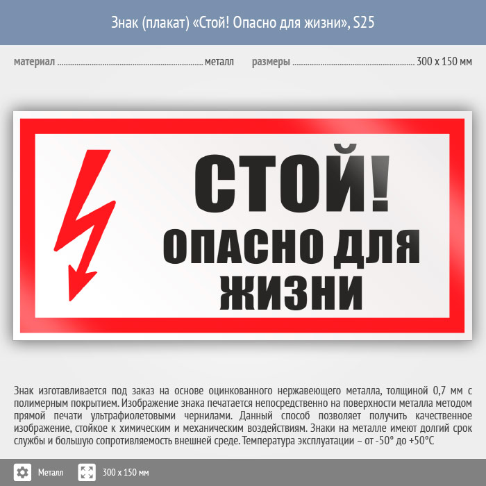 Знак (плакат) «Стой! Опасно для жизни», S25 (металл, 300х150 мм) в Железнодорожном купить