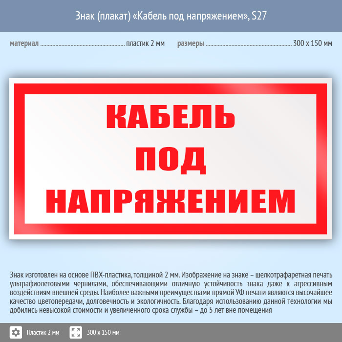 Знак (плакат) «Кабель под напряжением», S27 (пластик, 300х150 мм) в Железнодорожном купить
