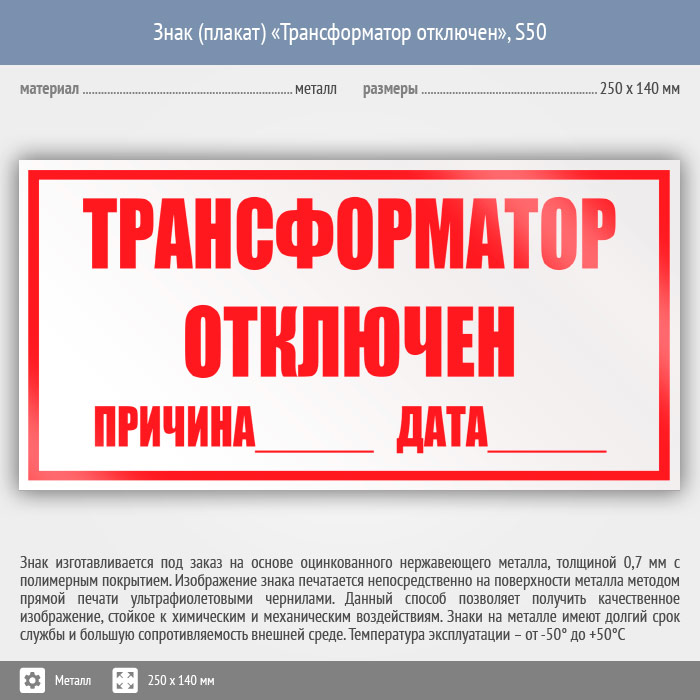 Знак (плакат) «Трансформатор отключен», S50 (металл, 250х140 мм) в Железнодорожном купить