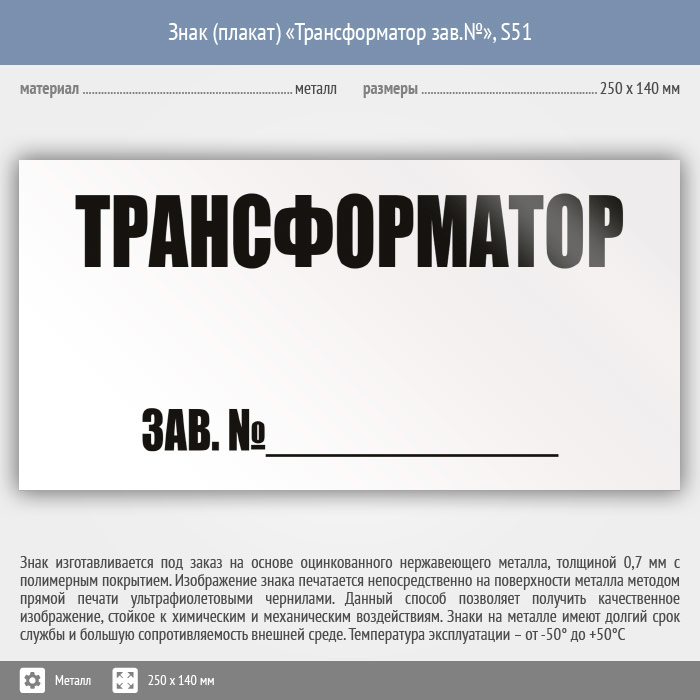 Знак (плакат) «Трансформатор зав.№», S51 (металл, 250х140 мм) в Железнодорожном купить