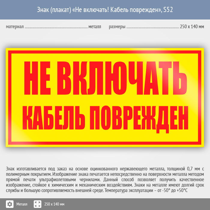 Знак (плакат) «Не включать! Кабель поврежден», S52 (металл, 250х140 мм) в Железнодорожном купить