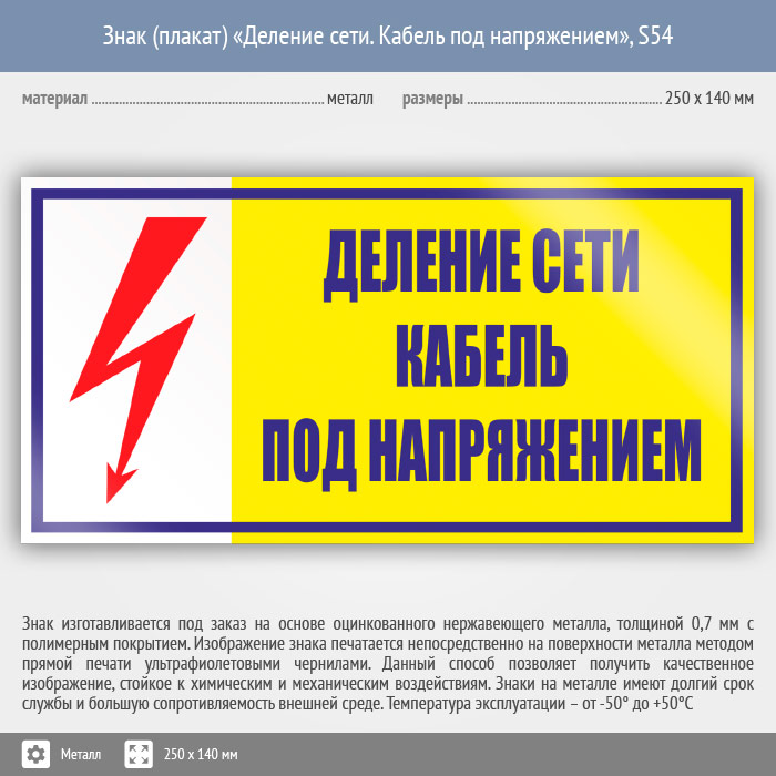 Знак (плакат) «Деление сети. Кабель под напряжением», S54 (металл, 250х140 мм) в Железнодорожном купить